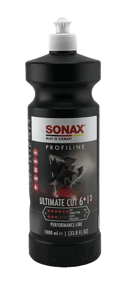 - Sonax Ultimate Cut is designed to achieve the highest cutting and polishing results without severly damaging the clear coat. Sanded areas up to P1000 can quickly and safely be removed with excellent gloss effect. Sonax Ulitimate Cut is water-based which offers a long working window and will not dry out like other compounds. It is also dust-free for easy clean up after use. Simply wipe off the polished area. Solvent-free and silicone-free makes it safe for use in body shops and collision centers. Recommended use with: Sonax Microfiber Cloths, Hybrid Wool Pad or Red Cutting Pad.